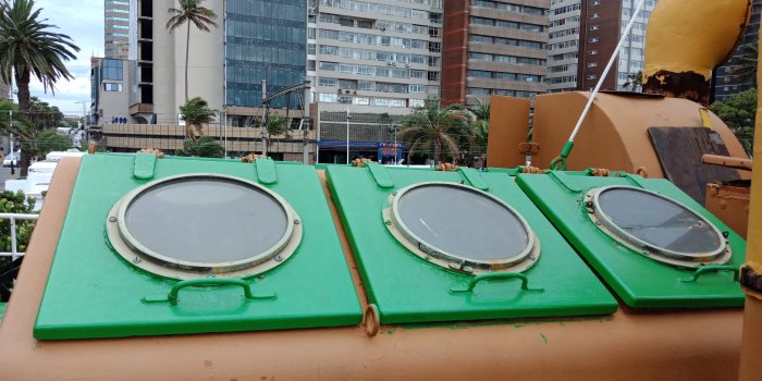 One of the coolest things we saw in Durban was a Nautical Museum that had a bunch of older boats in it. It was setup for an audio guide, but unfortunately there were no headphones, another symptom of how things were organized and complete at some time in the past but now everything is in disarray since certain people have taken over. It cost us a whopping 10 Rand to get into the museum so I can any really complain, but I could have learned so much more had I a guide, even an electronic one. There were two older tugboats and a military vessel. The things that fascinated us about them were the huge steam engines in one and all the different quarters for the different ranking personnel on the boat. There were pipes running from the engine room to the steering wheel with metal shapes foe speaking and listening on each end. There were pressure gauges and levers to push and pull. We can limber all around the motors and it’s not the kind of museum that would last long in the US because of all the places we could have fallen or got trapped, but I really enjoyed all the old gear we saw.. Here are some pics I took in the museum.
